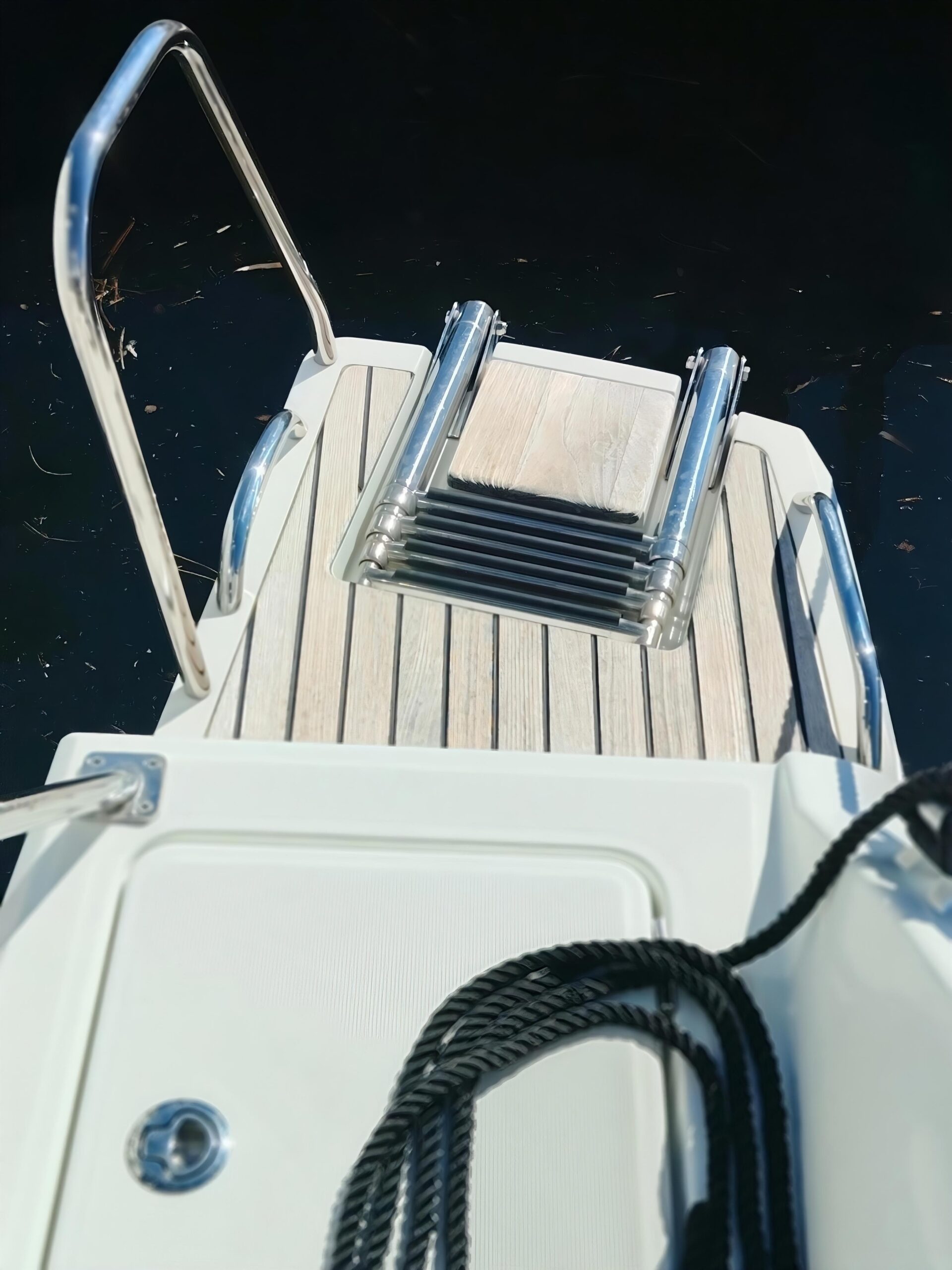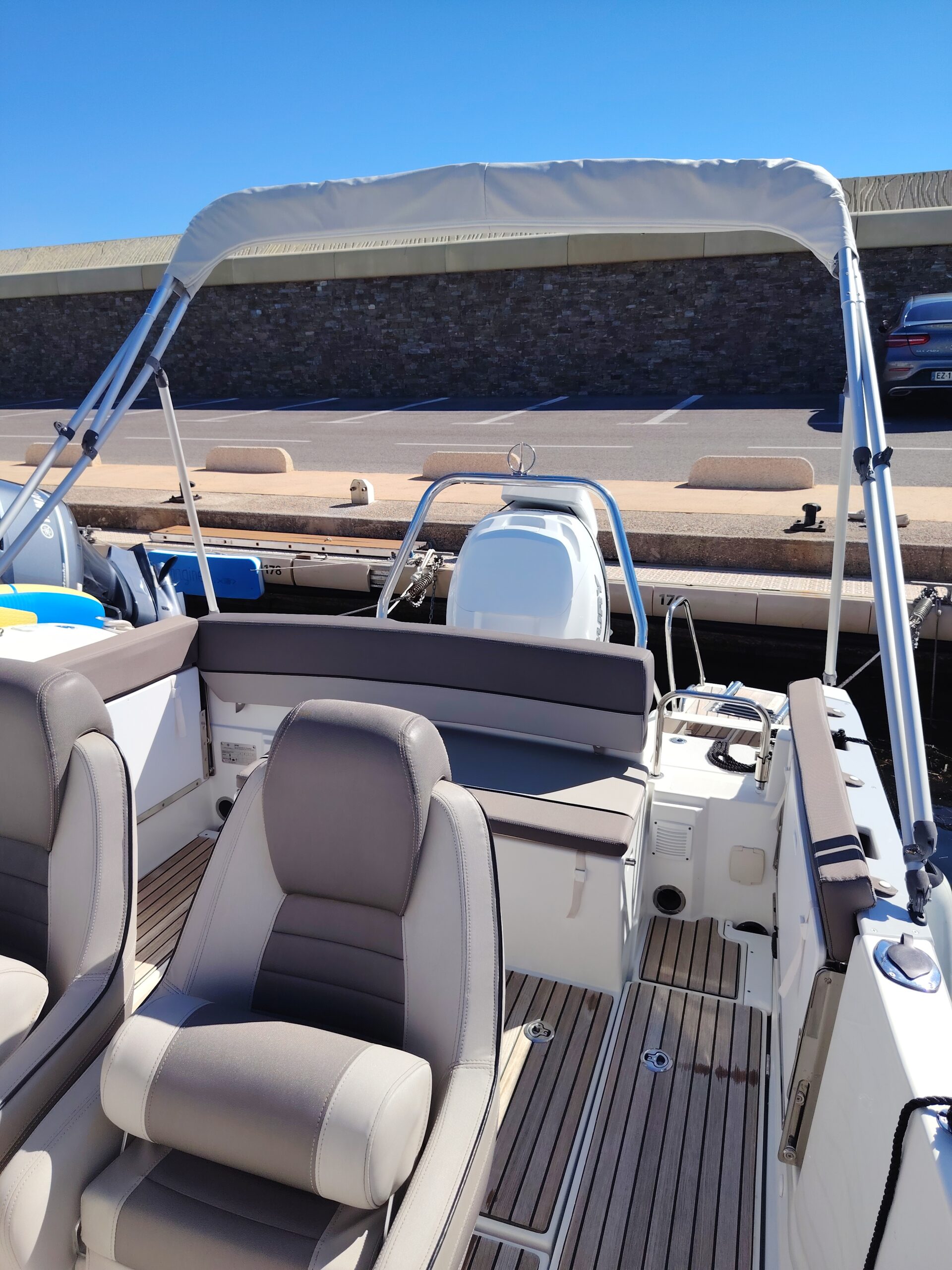 GPS Lowrance, guindeau électrique, cockpit en teck, mat de ski nautique, taud de console, bimini de cockpit, bimini carré avant, carré avant modulable en assise ou bain de soleil, 2 banquettes latérales arrières repliables, table, douchette de cockpit avant et arrière, échelle de bain avec grande main courante pour remonter.