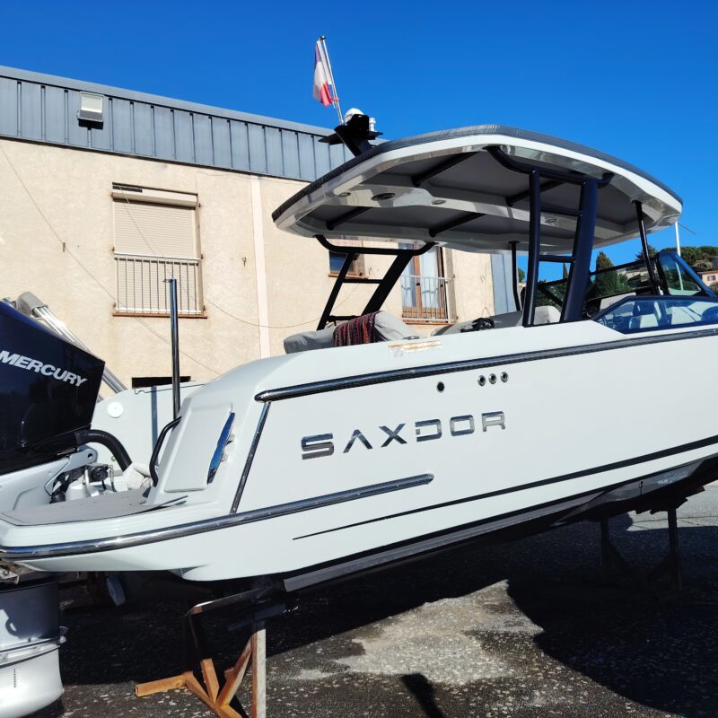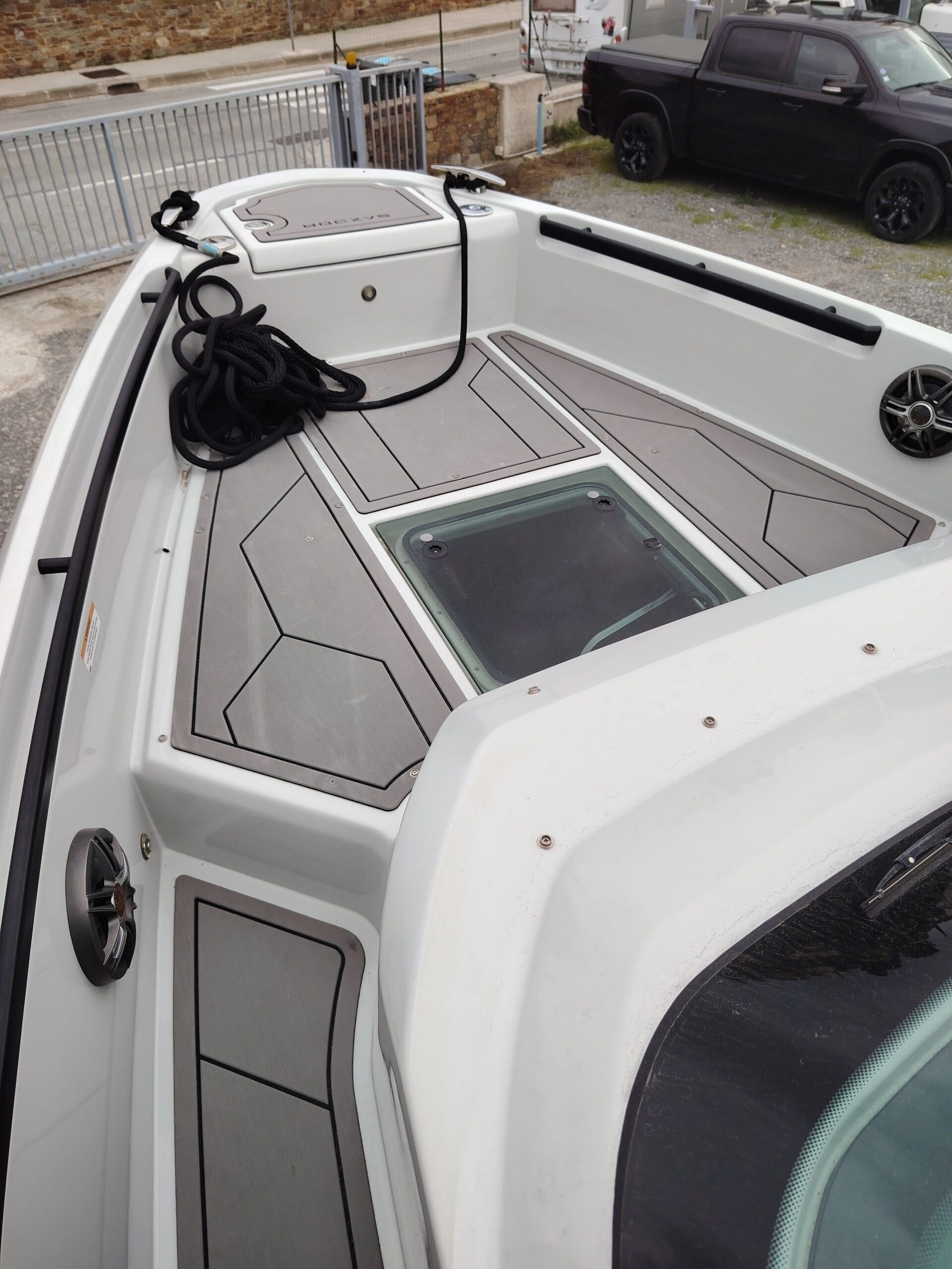 Moteurs Mercury 2 x 250 CV – 130h , GPS, VHF, guindeau électrique, flaps, kitchenette 1 feu à gaz avec évier, réfrigérateur, delphinière avec main courante, bain de soleil avant, carré arrière modulable